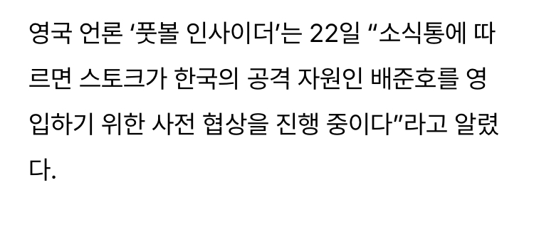 잉글랜드 2부리그 팀 스토크와 협상 중이라는 배준호