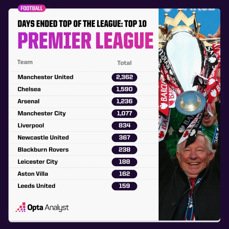 프리미어리그 역사상 1위로 마친 하루가 가장 많은 팀 TOP 10